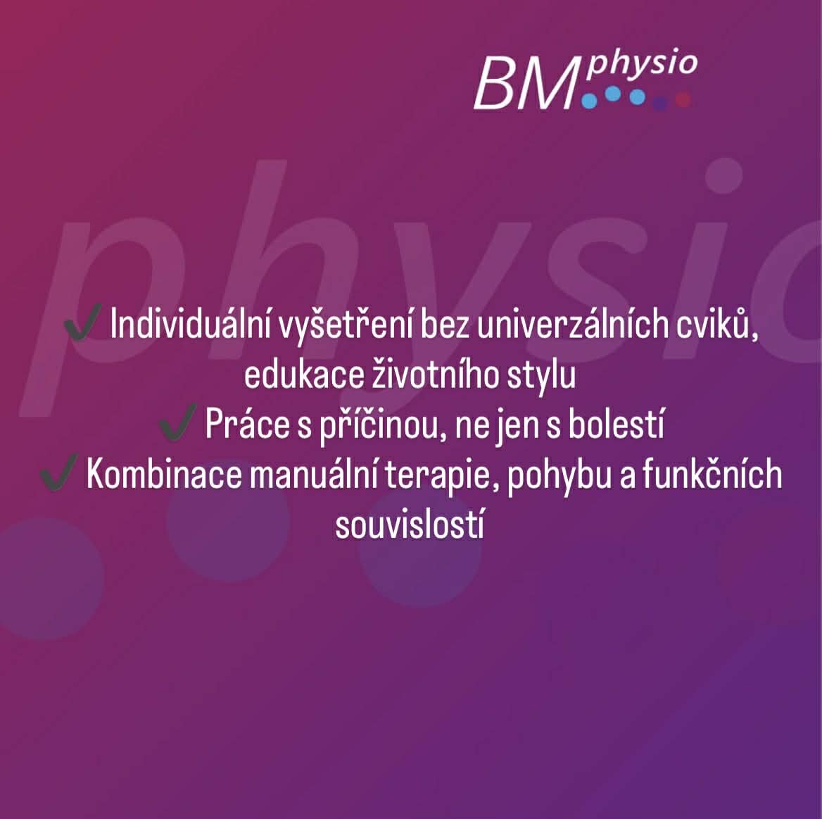 V BMphysio se nedíváme jen na místo bolesti. Hledáme souvislosti, příčiny a dlouhodobé řešení. Proto je naše fyzioterapie účinná, šetrná a dává smysl. BMphysio – fyzioterapie s individuálním přístupem, kde vaše tělo není jen diagnóza, ale příběh.