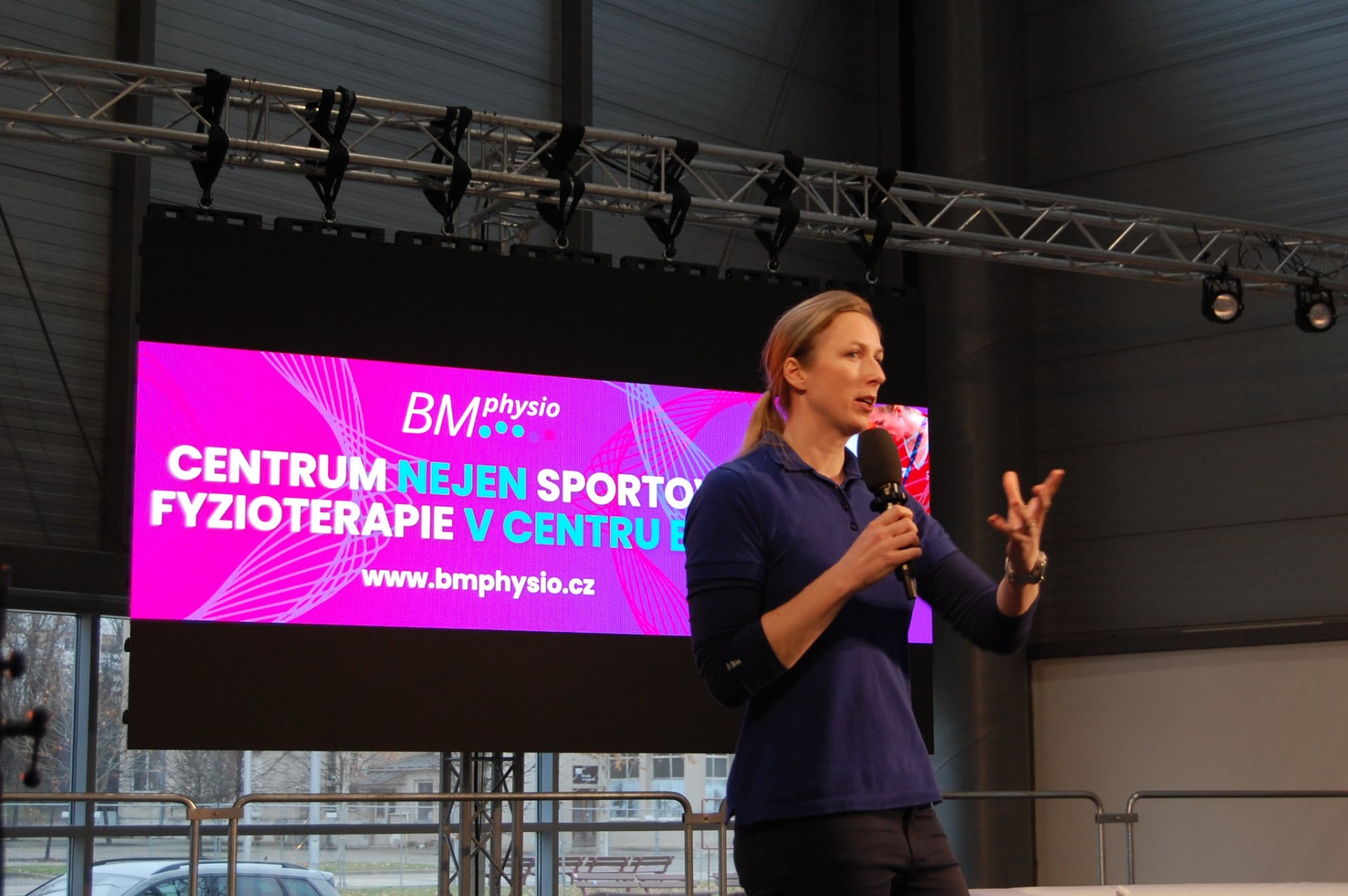 Velkým momentem byla i naše prezentace na hlavním pódiu zaměřená na sportovní fyzioterapii a prevenci přetížení u mladých sportovců. Součástí byla praktická ukázka vyšetření přímo před publikem, aby děti i rodiče viděli, jak fyzioterapeut pracuje a proč má smysl začít s prevencí včas. Velkou ctí nám bylo mít na našem stanovišti hostku Agátu Koupilovou - paraplavkyni a medailistku z MS 2025. Agáta si s námi zacvičila, podělila se o zkušenosti ze své sportovní přípravy a její rozhovor byl na hlavním pódiu součást nedělního programu festivalu.